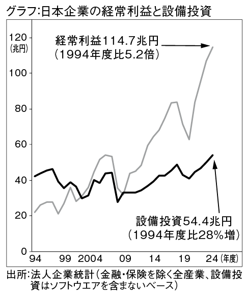 リーマン・ショックやコロナ禍による落ち込みを経て、日本の企業は再び投資を増やし始めている。法人企業統計によると24年度の設備投資(ソフトウエアを除く)は54.4兆円で、30年前(94年度)に比べて28%増えた。半導体のように成長が見込める分野を中心に伸びている。内閣府によると、企業が支払った賃金総額を示す名目雇用者報酬は316兆円と同20%増、個人消費は332兆円、同23%増である。設備投資が増えて、賃金が増え、消費が活性化するなど好循環が生まれているように見える。しかし、実はここ30年間で企業の利益はもっと早いスピードで増えている。法人企業統計によると、24年度の経常利益は114.7兆円と30年前の5.2倍になった(グラフ参照)。内部留保は同637兆円で4.6倍、現預金は同301兆円(うち東証プライム企業に限ると115兆円)と30年前の2倍に膨らんだ。つい最近までデフレの時代が長く続いたため、個人消費が低迷し、企業は設備投資に極めて慎重だった。大手証券や大手金融機関の経営破綻など90年代後半から2000年代前半まで続いた金融危機は企業が現預金を積み上げる強い誘因になった。ヒトへの投資も足りない。物価変動の影響を除いた実質賃金は30年以上にわたってマイナス基調となっており、24年度も前年度比0.5%減に沈んだ。