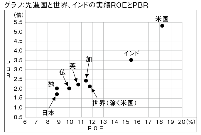 日本企業は好調な業績を背景にこれまで株主還元を拡充してきた。しかし、東証によると、日本の上場企業でROEが15%以上の企業の割合は19%と米国の61%、欧州の49%と比べれば依然低水準にあり、改善余地は大きい。今後見込まれるコーポレートガバナンス・コ—ド(企業統治指針)の改訂に向け、企業はキャッシュの使い道を再考し、適切な資源配分実現への動きを強めると予想される。日本企業のROEの上昇要因が、これまでの自社株買い中心によるものから、企業の成長投資による業績拡大(EPSの成長)要因が加わることになろう。日本企業のROEがフランス、イギリス、カナダ並みの10〜12%に高まれば、PBRは現状の1.7倍から2.0倍に評価されるだろう(グラフ参照)。25年12月末の日経平均の1株当たり純資産(BPS=2万9787円)をPBR2倍で評価すれば日経平均は約6万円と試算される。